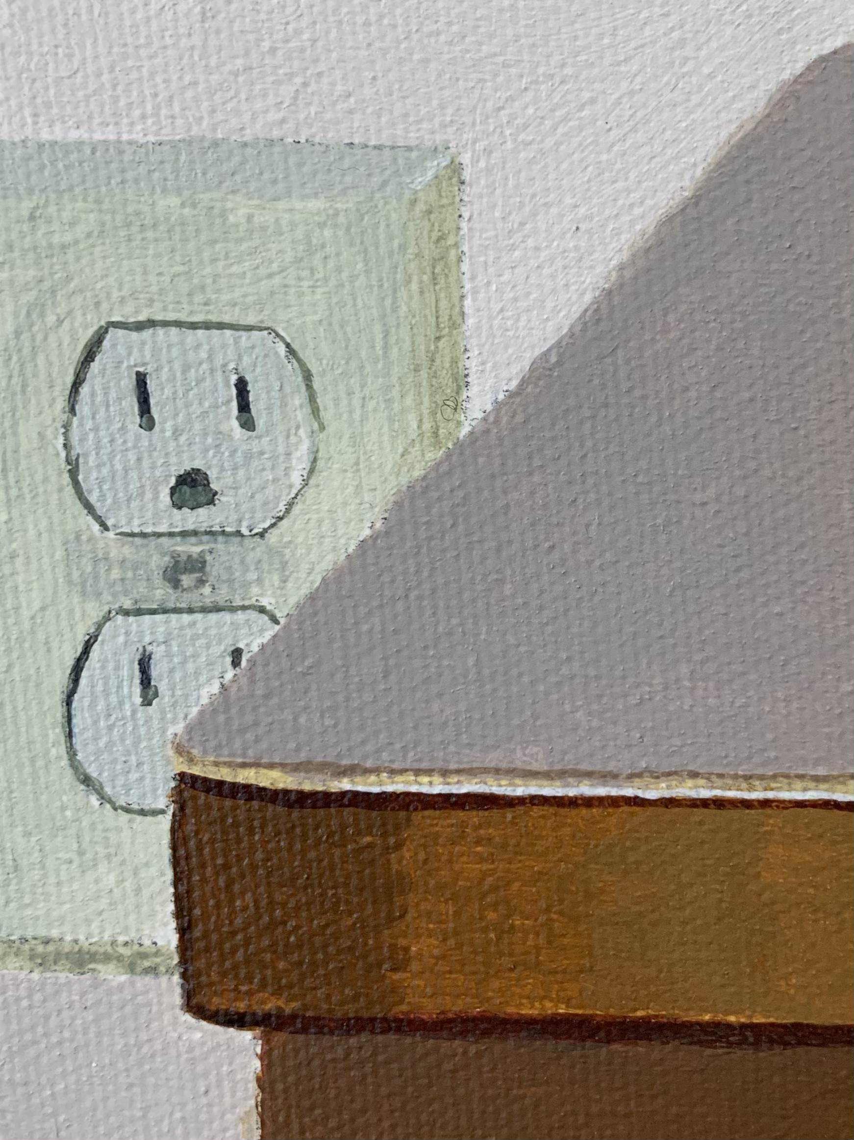 In Pink and Yellow Still-life with Cherished Items, I constructed a still-life using a selection of items accumulated over my lifetime. Items like the central silk bag and the hand-made golden wallet to the right of the bag were given to me by my paternal relatives on trips to visit them in Vancouver when I was little or sent to me in care packages. The coral cloth atop the wallet was scrap left over from a quilt I recently made for one of my great-aunties. When trying to understand myself as a Japanese/East-Asian/mixed-race woman, I often think of my grandma and my aunties. I think about their experiences in Canada and the things they did that I have always admired with wonder, like quilting, making clothes, crocheting, and baking. They always did these things for me and tried to teach me how to do them as well and that sharing of knowledge always felt like an ultimate expression of love. I take pride in doing these same things that they did to better understand who they were and to make them proud while simultaneously feeling closer to them and to who I am. In this still-life as well as many of my other still-lifes, I make reference to “Japonisme” painting of the mid to late 19th century in an effort to reinsert myself into the history in a way that gives myself agency while also being able to properly respect these treasured items of my family. In this particular painting, I also took inspiration from Edo period landscapes of mountainous terrain and bodies of water. The “Cherry Blossom” chocolate is one of my mother’s favorite treats and is a famously Canadian confectionary. Cherry blossoms or “sakura” is a beloved pink flower in Japan, which beautifully blooms on trees in the spring annually. When seeing the chocolate box I cannot help but think about my existence as a mixed-race woman.